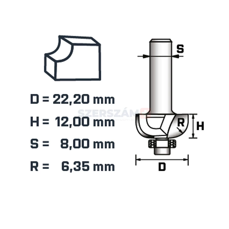 | cikkszám | D (Maróél átmérő) mm | H (Marás mélysége) mm | S (Szár átmérője) mm | R (Homorulat sugár) mm |