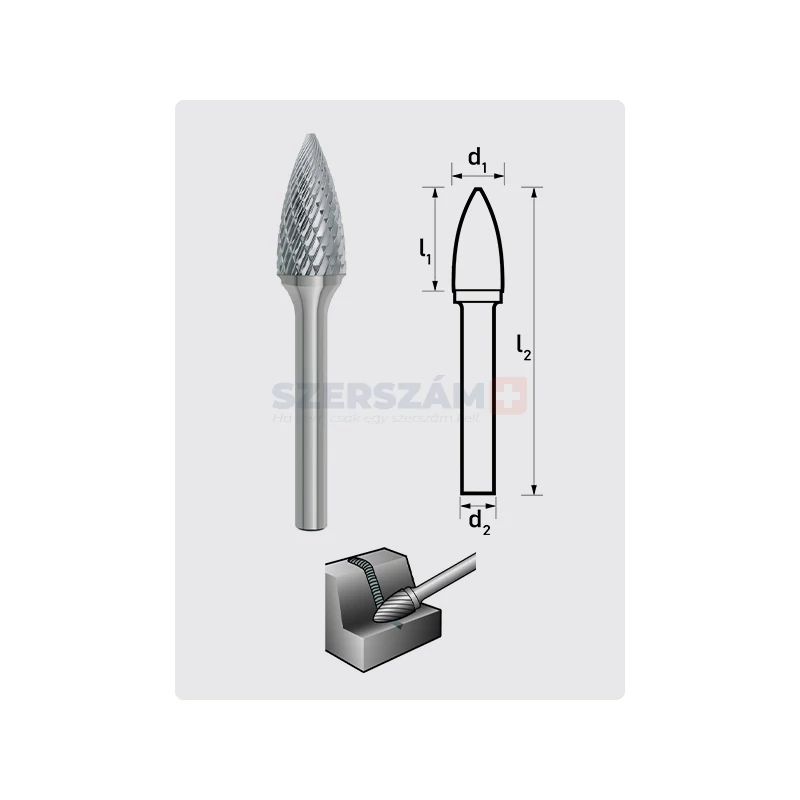 – Forma: A DIN 8032 szabvány szerinti csúcsíves alakú marócsap kúpos, ívelt hegyű, ami lehetővé teszi a pontos, ívelt felületek kialakítását.