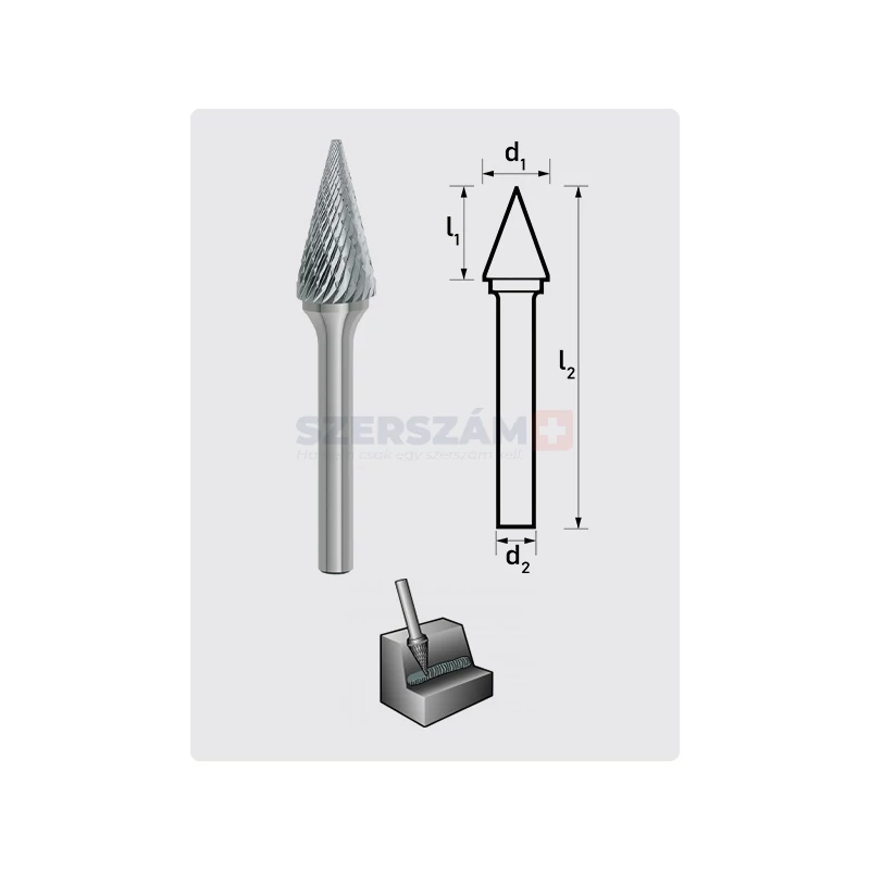 A kúpos, hegyes végű marócsap a DIN 8032 szabvány szerinti formával rendelkezik, biztosítva a precíz és megbízható szerszámkialakítást. A fogazás a DIN 8033 szabványnak megfelelően készült, ami garantálja a hatékony anyagleválasztást és a hosszú élettartamot. A marócsap csúcsvége tompított, ami növeli a szerszám stabilitását és csökkenti a törés kockázatát a finom munkák során, különösen akkor, ha szűk vagy nehezen hozzáférhető helyeken kell dolgozni. A keresztfogazat (MX) általános felhasználásra készült, és széleskörűen alkalmazható különböző anyagok megmunkálására. Ez a fogazattípus különösen előnyös, mert hatékonyan kombinálja a finom és durva vágási képességeket, így kiválóan alkalmas különböző megmunkálási feladatokhoz, legyen szó felületek simításáról, alakzatok kialakításáról vagy durvább anyagleválasztásról. Az MX keresztfogazat biztosítja a munkadarab felületének egyenletes megmunkálását, miközben csökkenti a vibrációt és növeli a szerszám élettartamát.