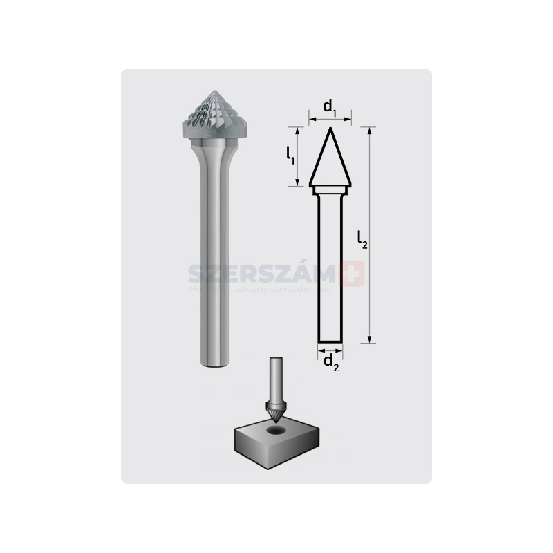 | Cikkszám | ø (mm) d1 | munkahossz (mm) l1 | csap ø (mm) d2 | teljes hossz (mm) l2 | fogazat | típus azonosító |