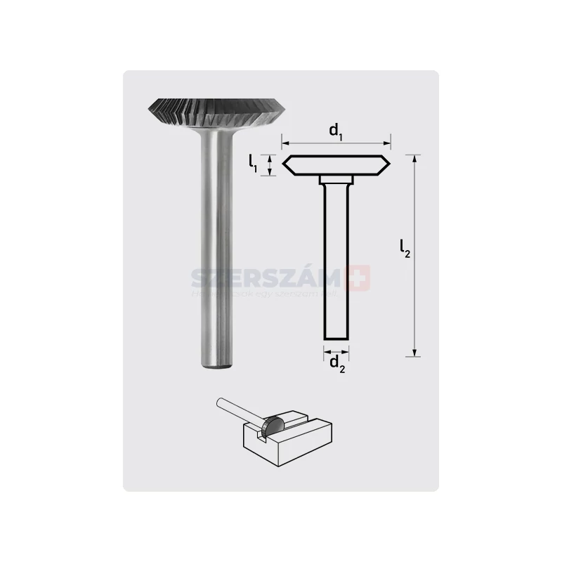 | Cikkszám | ø (mm) d1 | munkahossz (mm) l1 | csap ø (mm) d2 | teljes hossz (mm) l2 | fogazat | típus azonosító |