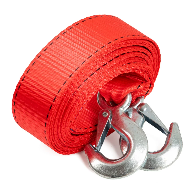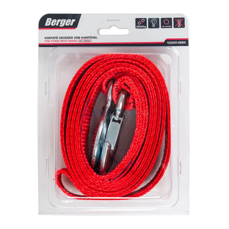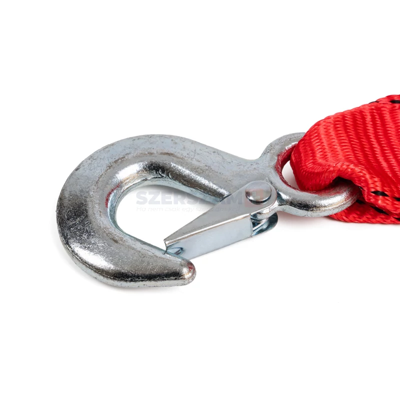 Erős poliészter heveder járművek vontatásához. A két végén található acél kampók gyors és biztonságos csatlakoztatást tesznek lehetővé a vontatási pontokhoz.