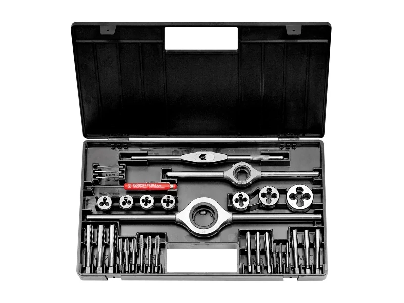 • HSS vagy WS anyagminőségű menetmetszők és menetfúrók, 60 fokos profilszöggel, normál metrikus menetek metszésére, fúrására