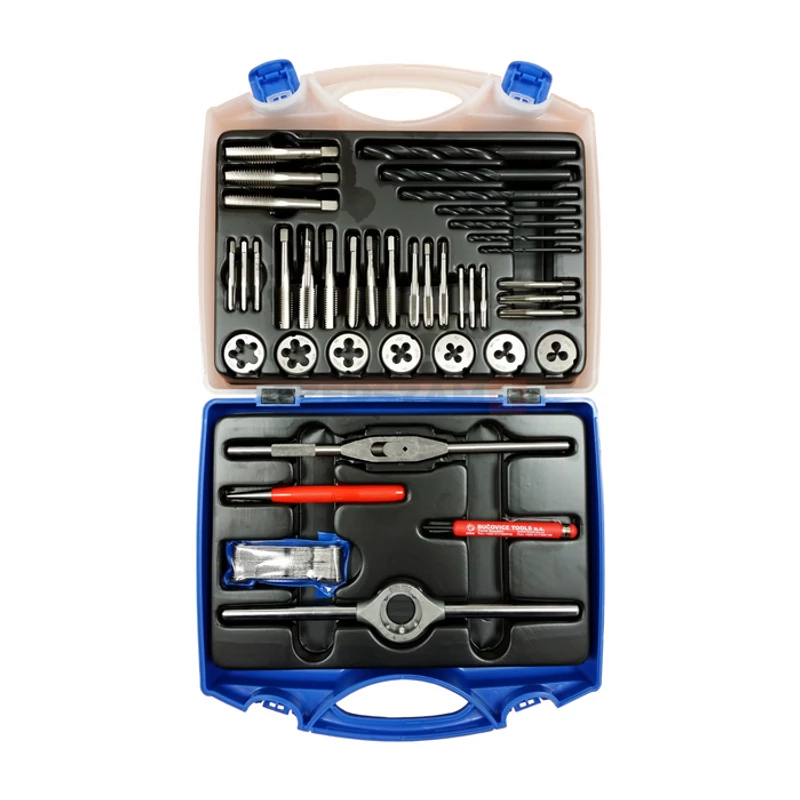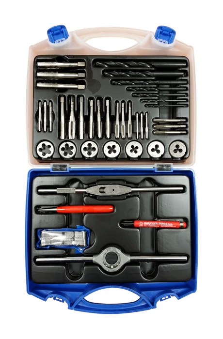 • HSS vagy WS anyagminőségű menetmetszők és menetfúrók, 60 fokos profilszöggel, normál metrikus menetek metszésére, fúrására