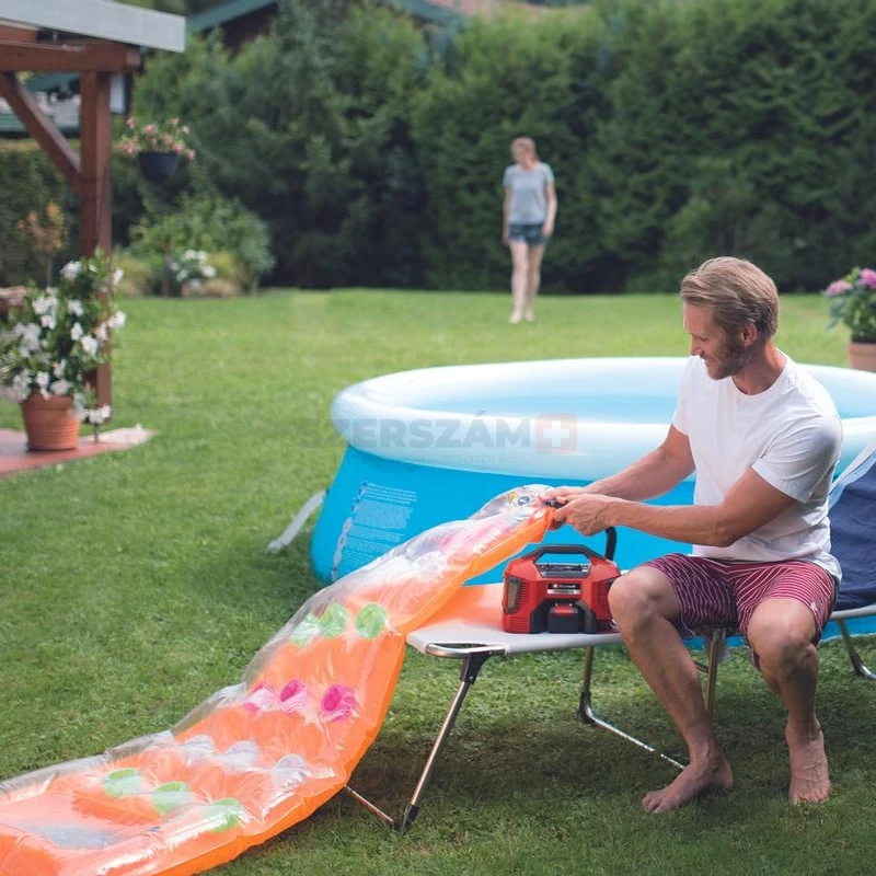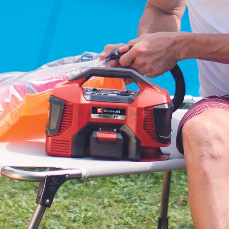 Az Einhell Pressito 18/21 akkumulátoros kompresszorból sosem fogy ki a szusz. Legyen szó pumpálásról vagy légtelenítésről, a kompresszor minden területen megállja a helyét! A kompresszor a Power X-Change termékcsalád tagja: a PXC-akku a sorozat valamennyi készülékéhez használható. A nagynyomású pumpának köszönhetően a kompresszor alkalmas autógumik, gumiabroncsok és labdák felfújására, az alacsony nyomású szívó funkció pedig segít ezek leengedésében. A digitális nyomásmérővel felszerelt digitális kompresszor kézi üzemeltetése rendkívül egyszerű. Válaszható mértékegységek a nyomás méréséhez: bar, PSI és kPa. A nyomást előre beállíthatja. Ha eléri ezt a nyomásértéket, a kompresszor automatikusan kikapcsol. Előzetes nyomásbeállítás nélkül a nyomógomb segítségével tudja nagynyomású pumpáláshoz használni a készüléket. A háromdarabos adapterkészletet a praktikus integrált tartóban tárolhatja. A készülék 1 db 18 V Power X-Change akkuval üzemeltethető. A készüléket akku és töltő nélkül szállítjuk. Ezeket külön – például praktikus kezdőcsomagok formájában – vásárolhatja meg.