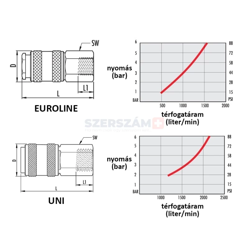 | cikkszám | csatlakozó méret (inch) | teljes hossz (L) (mm) | ø (D) (mm) | menet hossz (L1) (mm) | laptávolság (SW) (mm) | típus azonosító |