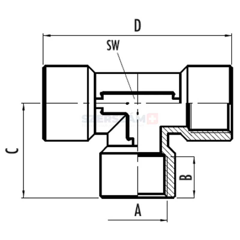 | cikkszám | csatlakozó méret (A) (inch) | menethossz (B) (mm) | elágazási magasság (C) (mm) | szélesség (D) (mm) | laptávolság (SW) (mm) | típus azonosító |