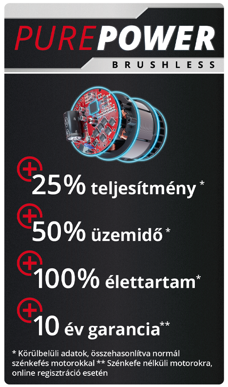Nem kell többé a súrlódásból fakadó veszteség, vagy a motor túlhevülése következtében felmerülő kényszerpihenők miatt aggódnia: PurePOWER Brushless motorral felszerelt készülékeink hosszabb akku-élettartamot és üzemidőt szavatolnak.