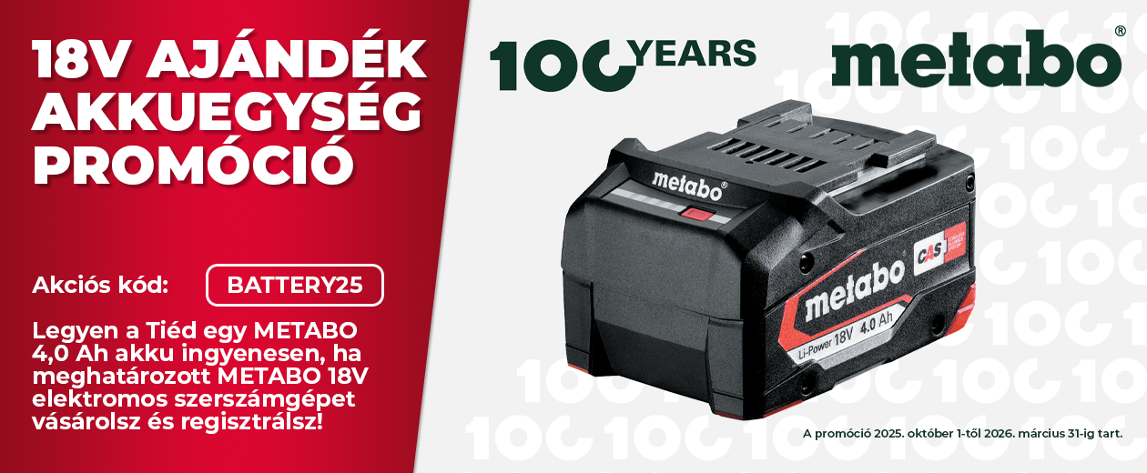 A SzerszámPlusz.hu, mint a METABO hivatalos LiHD Partnere a végfelhasználó részére az alábbi promóciót kínálja. A végfelhasználó által 2025. október 1. és 2026. március 31. között vásárolt meghatározott METABO 18 V-os akkus elektromos kéziszerszámgép után a METABO-tól a végfelhasználó ingyenesen 18 V-os Li-Power 4,0 Ah akkumulátoregységet kap, ha regisztrálja a szerszámgépet a kampányidőszakon belül. A METABO a vásárolt akkus elektromos kéziszerszámgéphoz illő akkumulátoregységet küld. A regisztrációnak legkésőbb a vásárlástól számított 4 héten belül meg kell történnie.