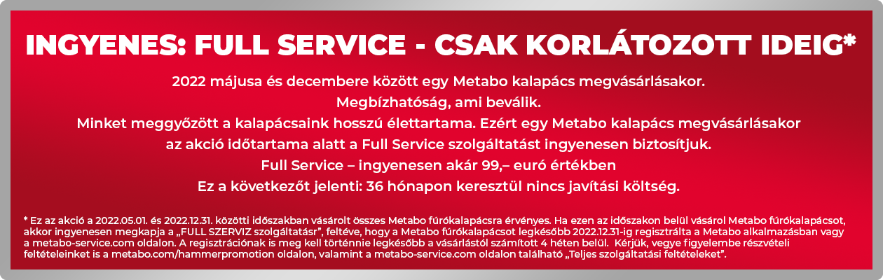 A FULL Service-re vonatkozó bővebb információkat, valamint a szolgáltatásokra vonatkozó feltételeket itt találhatja meg: www.metabo-service.com/hu/login
