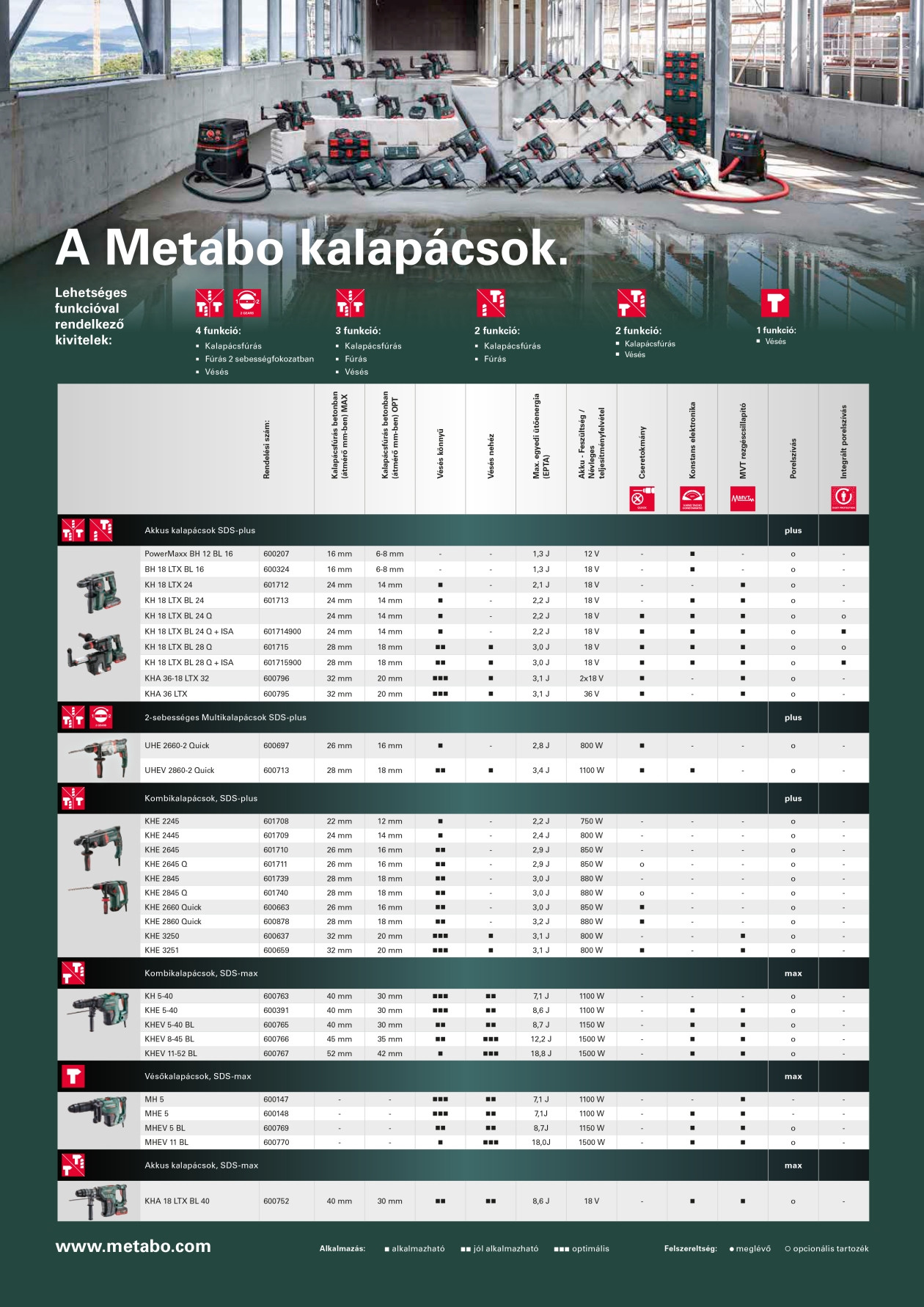 A nagy teljesítményű Metabo kalapácsok mindig akkor a megfelelőek, ha olyan kemény anyagok megmunkálásáról van szó, mint pl. kő vagy beton. A pneumatikus ütőmechanizmus szinte rányomás nélkül ütéseket gyakorol rendkívül nagy ütőenergiával. A nagy teljesítményű ütőművet az alumínium ötvözetből készült házba precíziósan helyezték el, ami akár a legkeményebb mechanikus terheléseknek is ellenáll. A rendkívüli erő felhasználóoptimált ergonómiával a Metabo kalapácsokat ideális szerszámokká teszi a szélsőséges alkalmazásoknál. A kompakt akkus, multi-, fúró- és kombikalapácsokkal az SDS-plus területen egészen a rendkívül erős KHE 96 SDS-max kombikalapácsig 1.700 Watttal és 20 J egyedi ütőenergiával (az EPTA szerint) minden alkalmazáshoz a megfelelő géppel szolgálunk.