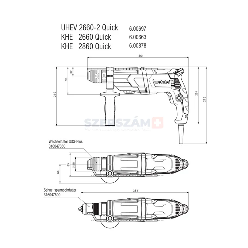 - Metabo Quick: az SDS-Plus kalapácstokmány és a gyorsszorító fúrótokmány közti gyors cseréhez, a fában és fémben való fúráshoz