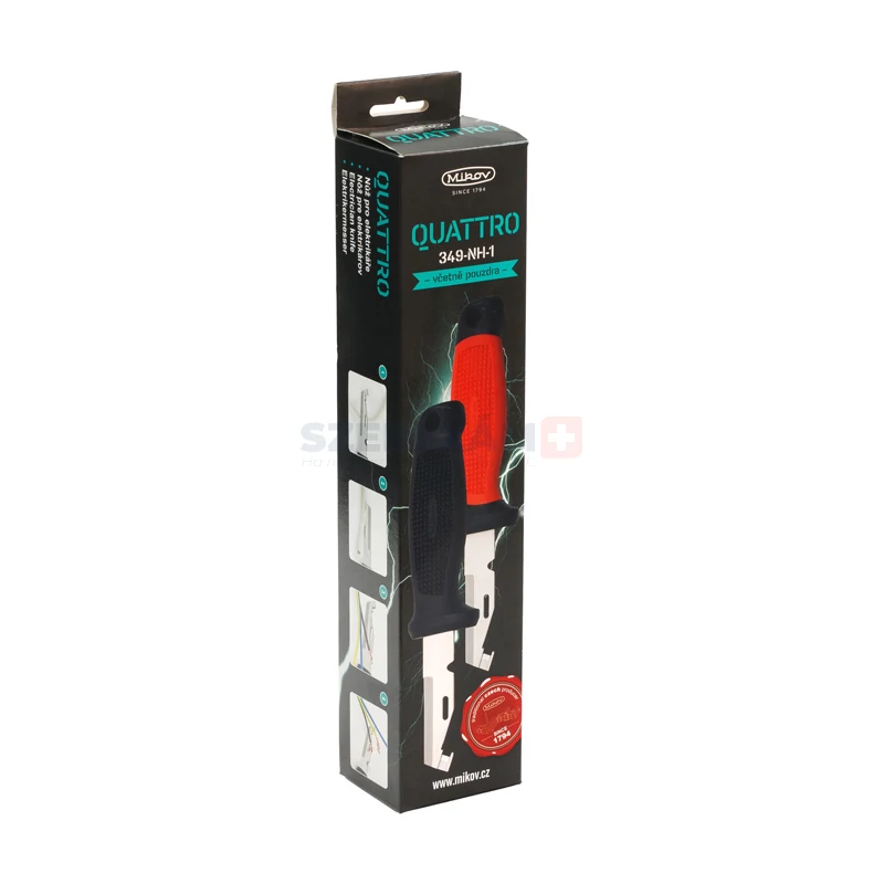 • A QUATTRO 349 kést néhány éve gyártják Mikulášovice városában. Mára ez a villanyszerelő kés a legnépszerűbb modellek egyike. A penge 420-as rozsdamentes acélból készül, 52–55 HRc keménységgel, és többfunkciós kialakítással rendelkezik: