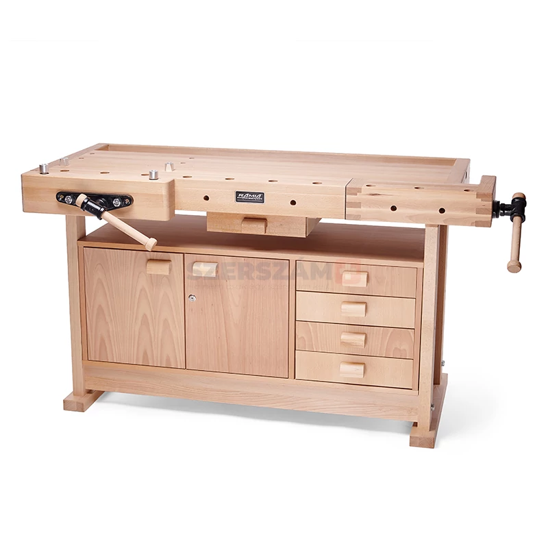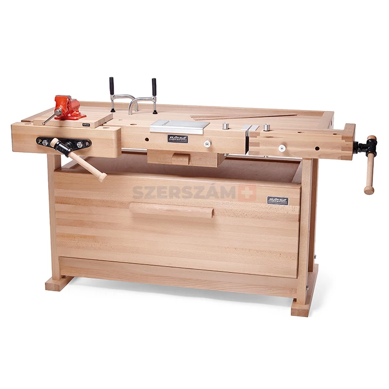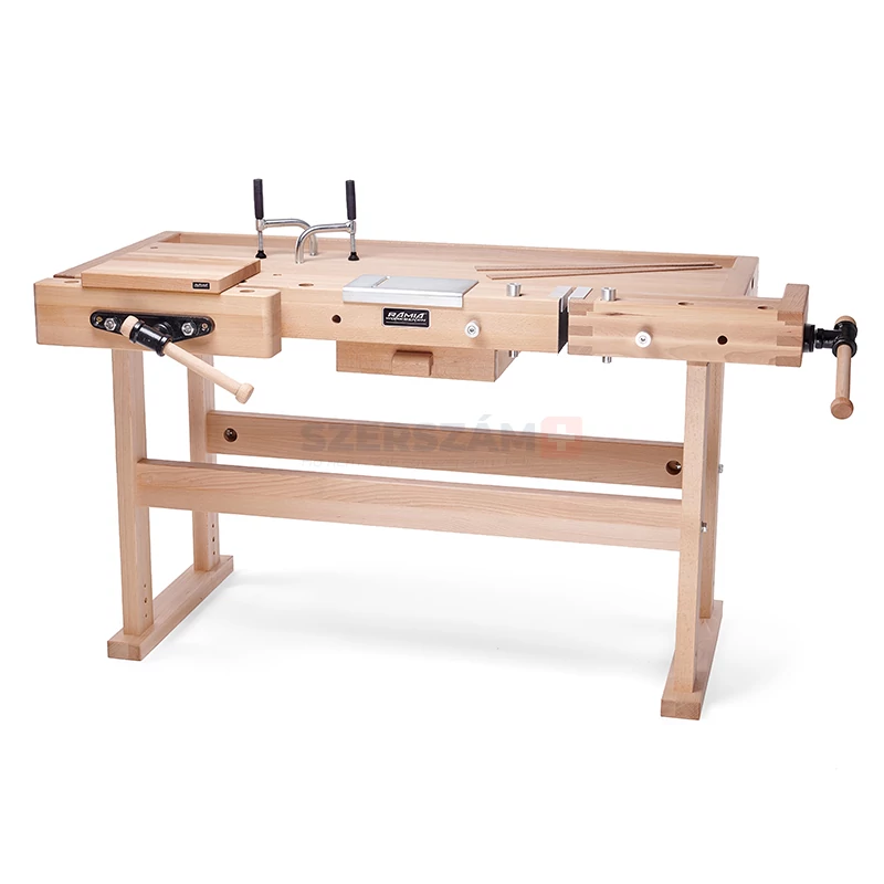 A PREMIUM PLUS 1600 gyalupadot kis méretű műhelyek számára tervezték. Két fém mechanikával és dupla vezetőrúddal készült satuval rendelkezik. Az elülső satu 520mm hosszú és 70mm széles, robusztus kivitelű. Az oldalsó satu 450mm hosszú és 140mm széles. Az oldalsó satun 3 + 2, a munkalapon 7 + 6 furat található a padvasak számára. Az elülső satun 2 furat található a padvasak számára. A munkalap 110mm magas oldalfalán és az oldalsó satu oldálán 2 - 2 furat található a padvasak számára a munkadarab függőleges rögzítéséhez.