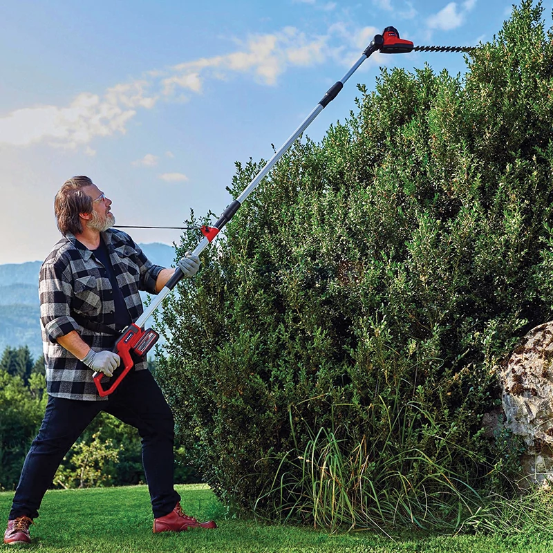 Az Einhell magassági sövényvágó a maximális rugalmasságot és nagy teljesítményt biztosító Power X-Change rendszercsalád tagja. A PXC rendszercsalád kiváló minőségű lítium-ion akkumulátorait a sorozat valamennyi készülékéhez felhasználhatja. A sövényvágó kései lézerrel vágott, gyémántcsiszolású acélból készültek. A 410 mm-es maximális vágáshosszúság és a percenkénti 1400-as vágásszám gyors és hatékony munkavégzést biztosít. A hét különböző fokozatba dönthető motorfej és a forgatható főfogantyú rugalmas használatot tesz lehetővé. A gumírozott markolat biztos és erős tartást garantál, és a hevederrel együtt kényelmes, ergonomikus munkavégzést szavatol. Az erős fém hajtómű hosszú élettartamot garantál a készüléknek. A hosszabbítónyélnek köszönhetően a magassági sövényvágót magasabb sövényekhez is használhatja. Ha nem dolgozik a sövényvágóval, akkor húzza a gyári csomagolásban lévő kemény védőtokot a vágókésekre: így biztonságosan és egyszerűen szállíthatja, illetve tárolhatja a készüléket. A készülék akkumulátor és töltőkészülék nélküli kivitelben érhető el. Ezeket külön – például praktikus kezdőcsomag formájában – vásárolhatja meg.