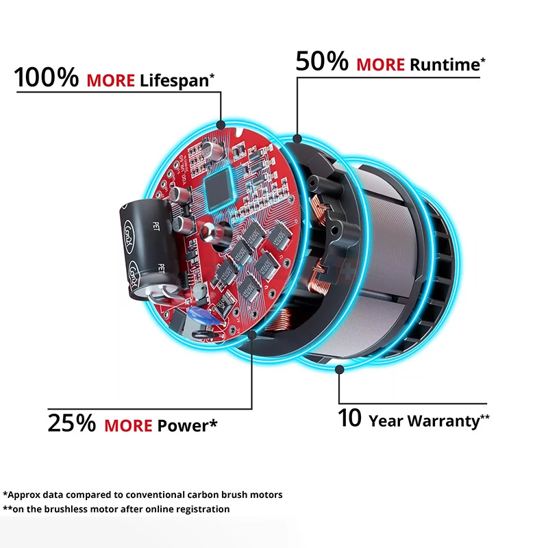 • Brushless: 10 év garancia a motorra regisztráció után.