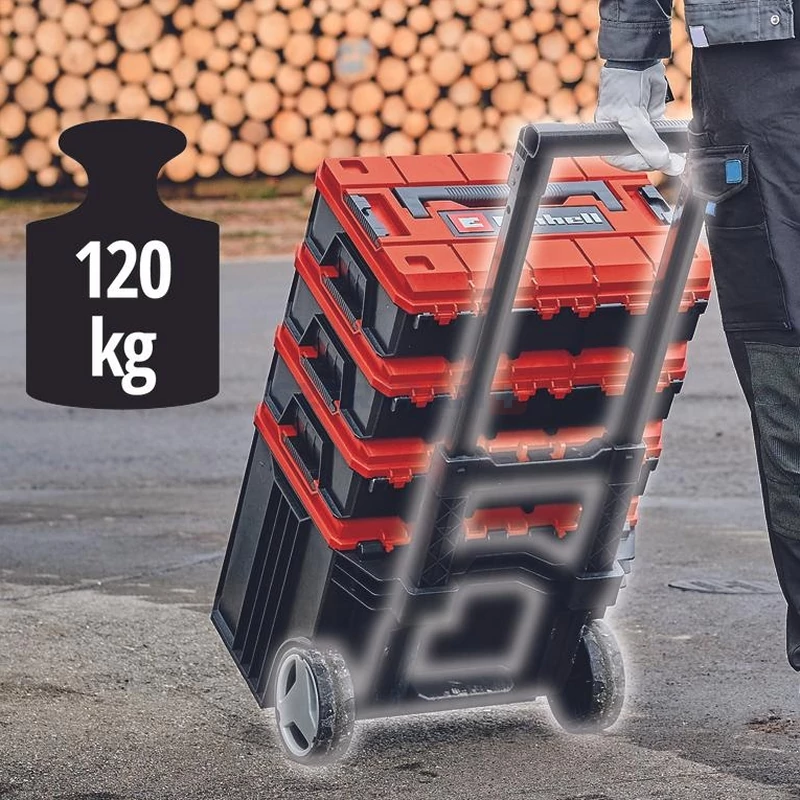 A szerszámgépek szállítására és tárolására tervezett Einhell E-Case L a moduláris E-Case rendszercsalád tagja. Az egymásra helyezett koffereket egymáshoz rögzítheti a praktikus zárrendszer segítségével, így az Einhell koncepciója helytakarékos, biztonságos és rendezett tárolást tesz lehetővé. A rendkívül masszív hő- és ütésálló koffer polipropilénből készült. A stabil konstrukció révén akár 120 kg összterhet is tárolhat benne. A kihúzható és extra széles markolatnak köszönhetően rendkívül egyszerű a szerszámgépek tárolása és szállítása. A nagy kerekek könnyű mozgatást tesznek lehetővé, bármilyen felületen húzza is a koffereket. Az intelligens kialakításnak köszönhetően a koffer fröccsenő víz ellen védett, így a viszontagságos időjárás sem árthat neki A maximális kényelemről a rögzíthető fogantyú gondoskodik, melynek segítségével sokkal könnyebben kiveheti pl. a koffert a csomagtartóból. A lopások és visszaélések megelőzése érdekében az E-Case L koffer lakattal is zárható. A gyári csomagolás tartalmaz egy szerszámgépekhez használható, kivehető betétet, valamint feliratozható címkét, amelyen jelölheti a koffer tartalmát.