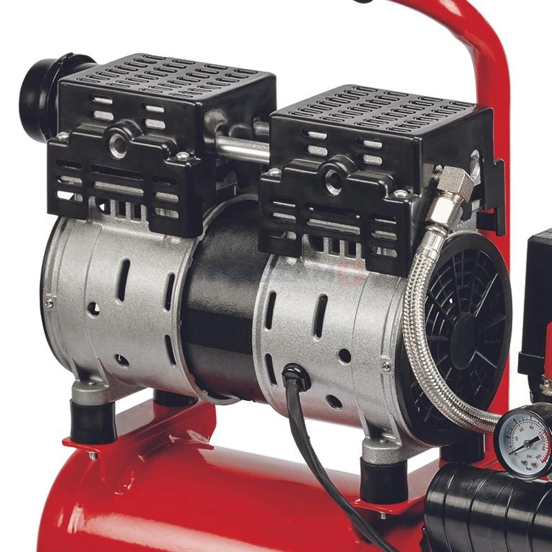 A TE-AC 6 Silent kompresszor egy olyan multifunkcionális alapkészülék, amely nem hiányozhat egyetlen garázsból és műhelyből sem! A kompresszort alacsony zajkibocsátása teszi egyedivé. A készülék rendkívül halk, 550 watt teljesítményének köszönhetően pedig biztos lehet abban, hogy mindig lesz elegendő mennyiségű és intenzitású levegő a munka elvégzéséhez. A kompresszor az 57dB (LpA/hangnyomásszint-érték) zajkibocsátással lényegesen csendesebb, mint az azonos teljesítményű, hagyományos kompresszorok. A készüléket csekély karbantartást igénylő, olaj- és karbantartásmentes motorral tervezték. A vízleeresztő csavar kényelmes és egyszerű karbantartást tesz lehetővé. A mobil kompresszor 6 liter űrtartalmú sűrített levegő tartálya elegendő levegőt biztosít ahhoz, hogy a megfelelő szerszámok használatával pillanatok alatt felvigye a festék- és lakkrétegeket. A nagyobb fafelületeket is könnyedén impregnálhatja, ha olajat használ festék helyett. Festéshez vagy homokfúváshoz szeretné használni? A kompresszor mindkét területen megállja a helyét! A készülékkel könnyedén felfújhatja a labdákat, gumimatracokat, vagy az autók és (motor)kerékpárok kerekeit. Az Einhell elhivatottan bízik termékei minőségében, ezért a tartályra 10 év rozsdamentességi garanciát vállalunk. A kompresszor nyomáscsökkentő használatával max. 8 bar nyomásig számos feladatra használható. A kompresszort nyomásmérővel és gyorscsatlakozóval látták el a szabályozott üzemi nyomás biztosítása érdekében. A felhasználó biztonságáról a biztonsági szelep gondoskodik. A könnyű mozgatást a kis súly és a praktikus fogantyú teszi lehetővé: a kompresszor alig néhány mozdulattal szállíthatóvá alakítható. A rezgéscsillapított lábak használat közben maximális stabilitást biztosítanak.