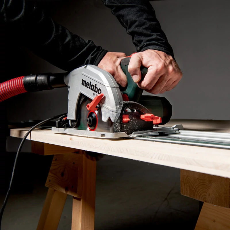 - Robusztus kézi körfűrész, közvetlenül a Metabo és egyéb gyártók vezetősíneire helyezve használható a pontos, hosszú vágásokhoz