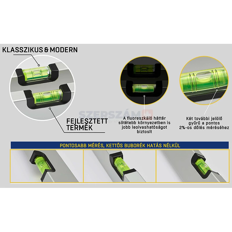 • Számos előnyt nyújtó, fejlesztett horizontális libellával