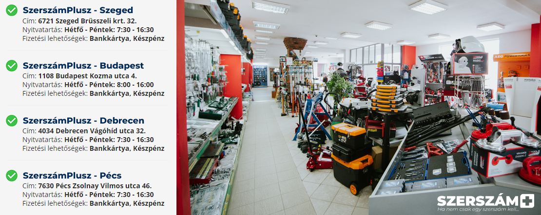 Szaküzleteink listáját, elérhetőségeiket, ingyenesen biztosított egyéb szolgáltatásaikat, nyitvatartási idejüket és a fizetési lehetőségeket az alábbi linken keresztül is eléred: SzerszámPlusz szaküzletek