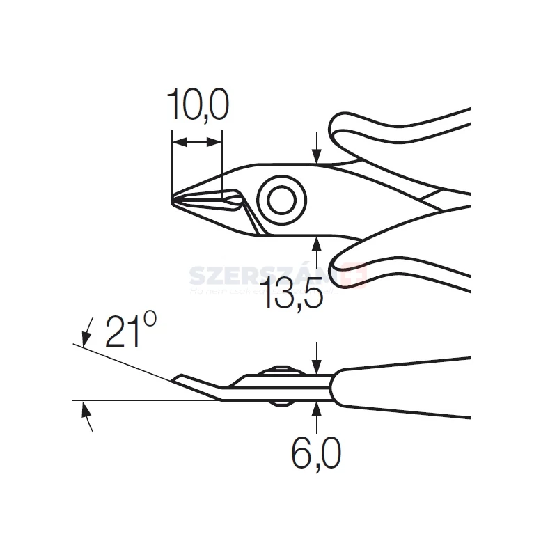 • Széles, hegyes pofa, preciziós, fazetta nélküli vágóél kinyitó rugóval