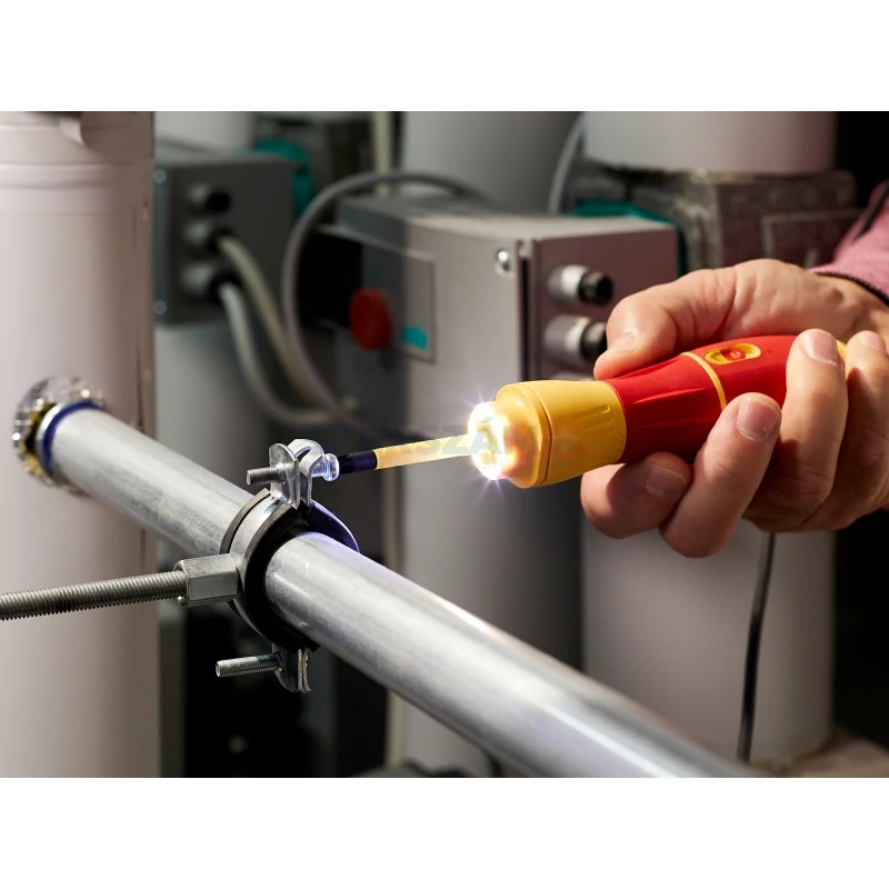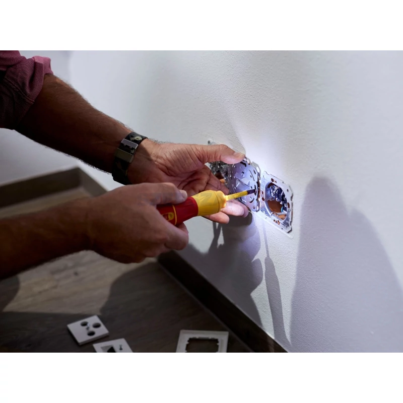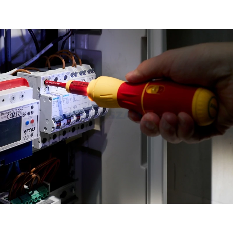 • VDE és IEC tanúsítvánnyal rendelkező termékként az e-csavarhúzó használata engedélyezett 1.000 V-os váltóáramú feszültségvezető alkatrészeken, így biztosítva teljeskörű védelmet a napi munkavégzés során a villanyszerelők számára.