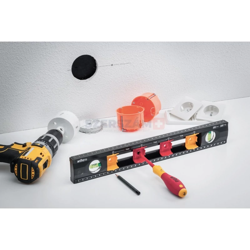 • Villanyszerelők részére, süllyesztett aljzatok távolságainak vízszintes és függőleges méréséhez és jelöléséhez