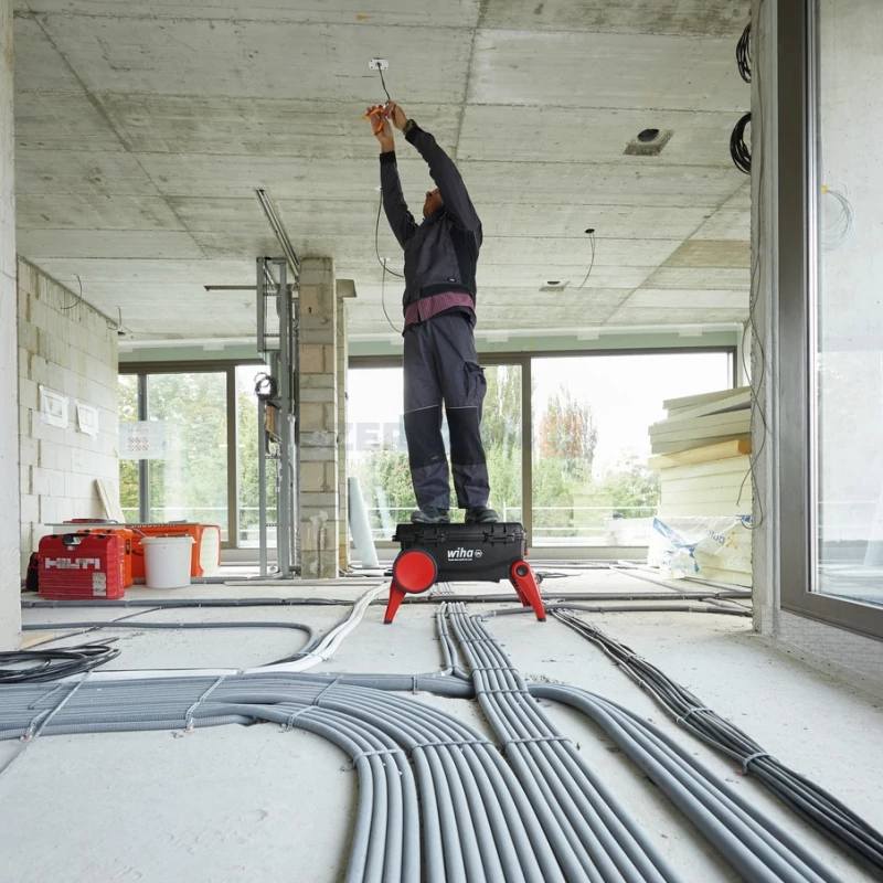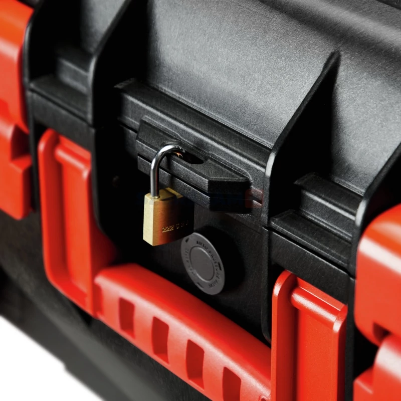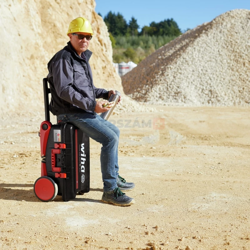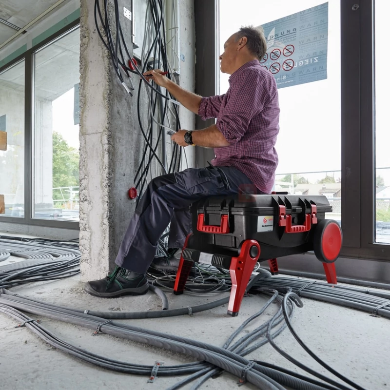 • A poliamid (PA) kihajtható lábaknak köszönhetően a koffer munkapaddá és fellépővé alakítható, erre állva magasban lévő területeket is könnyedén elérhetők, illetve a szerszámok ki-be pakolása is kényelmesebb
